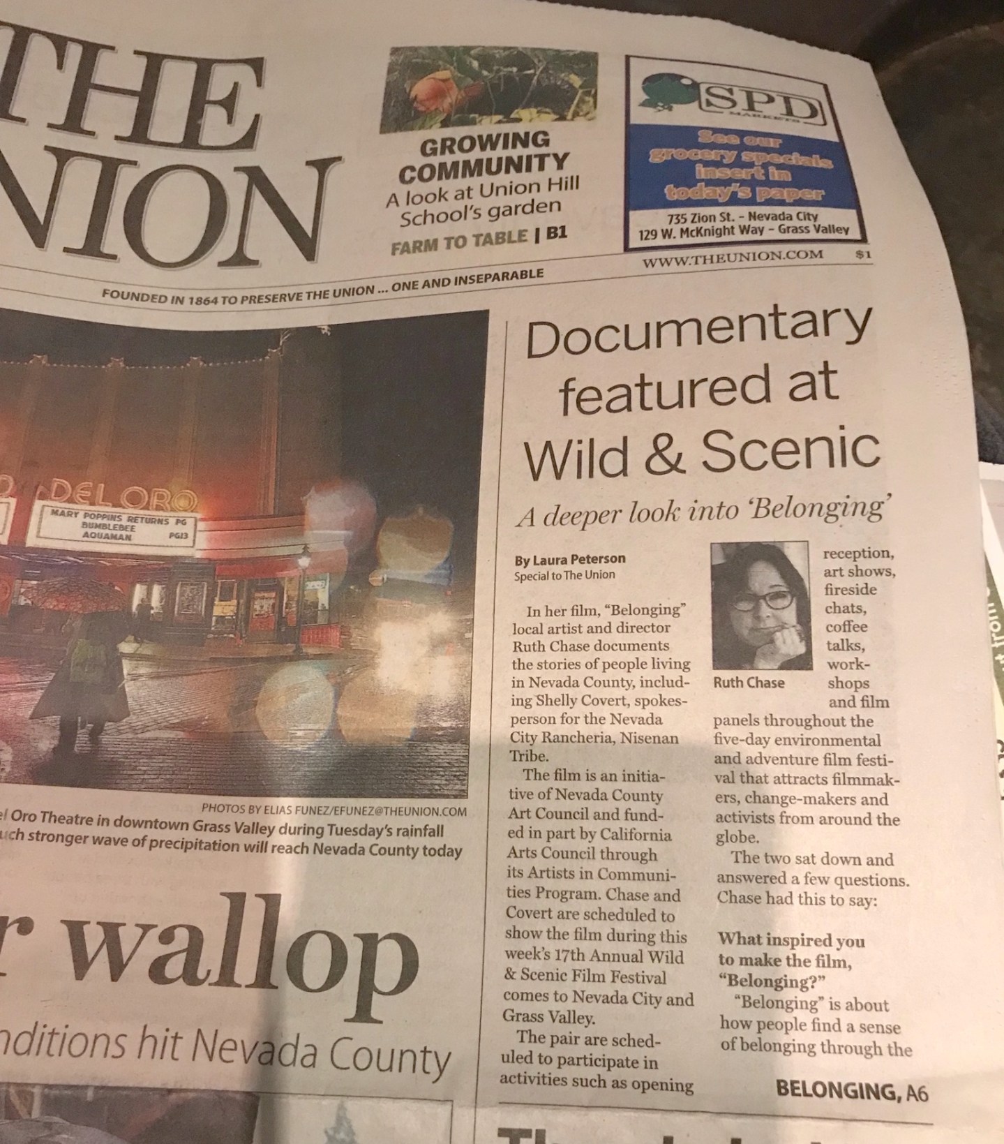 In her film, “Belonging” local artist and director, Ruth Chase documents the stories of people living in Nevada County, including Shelly Covert, spokesperson for the Nevada City Rancheria, Nisenan Tribe.