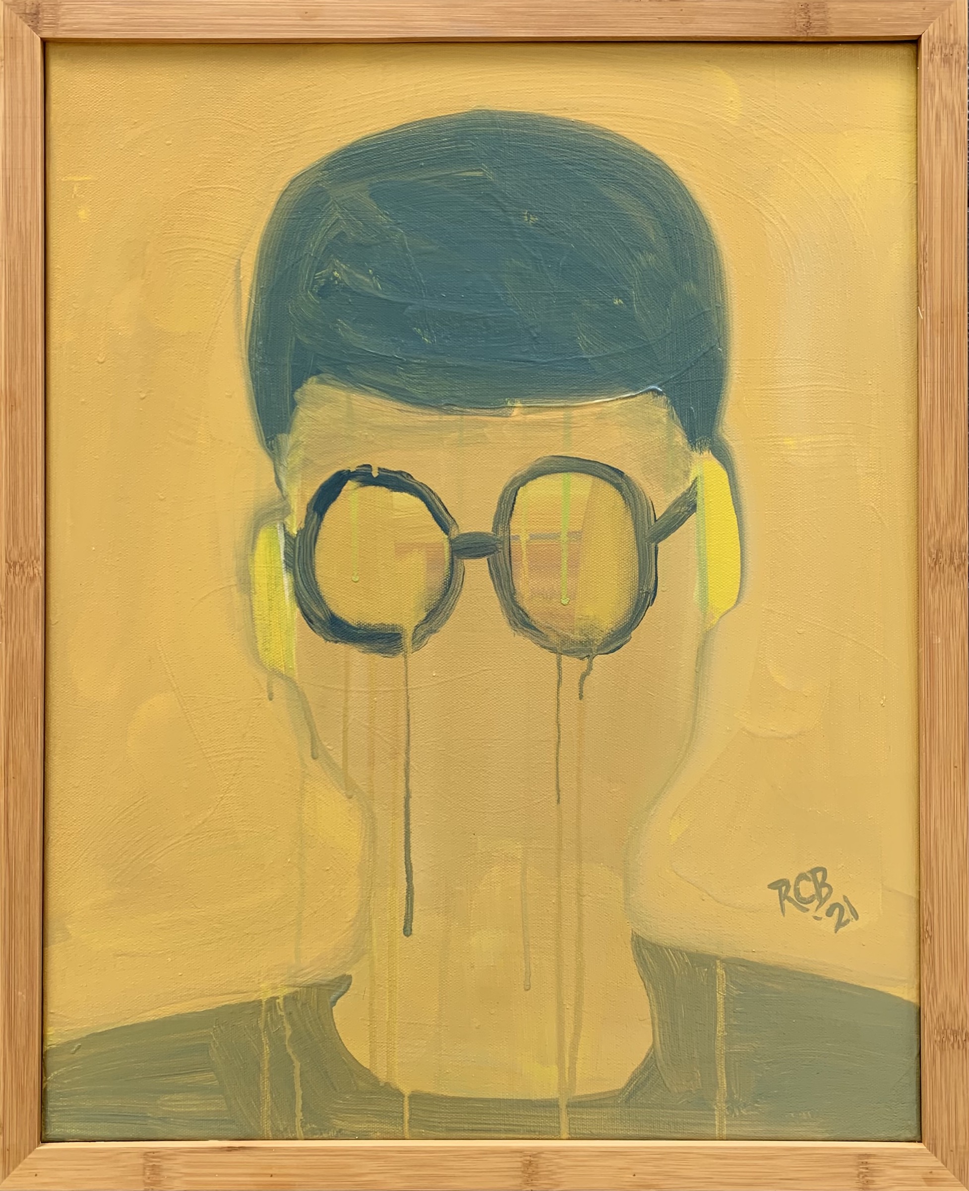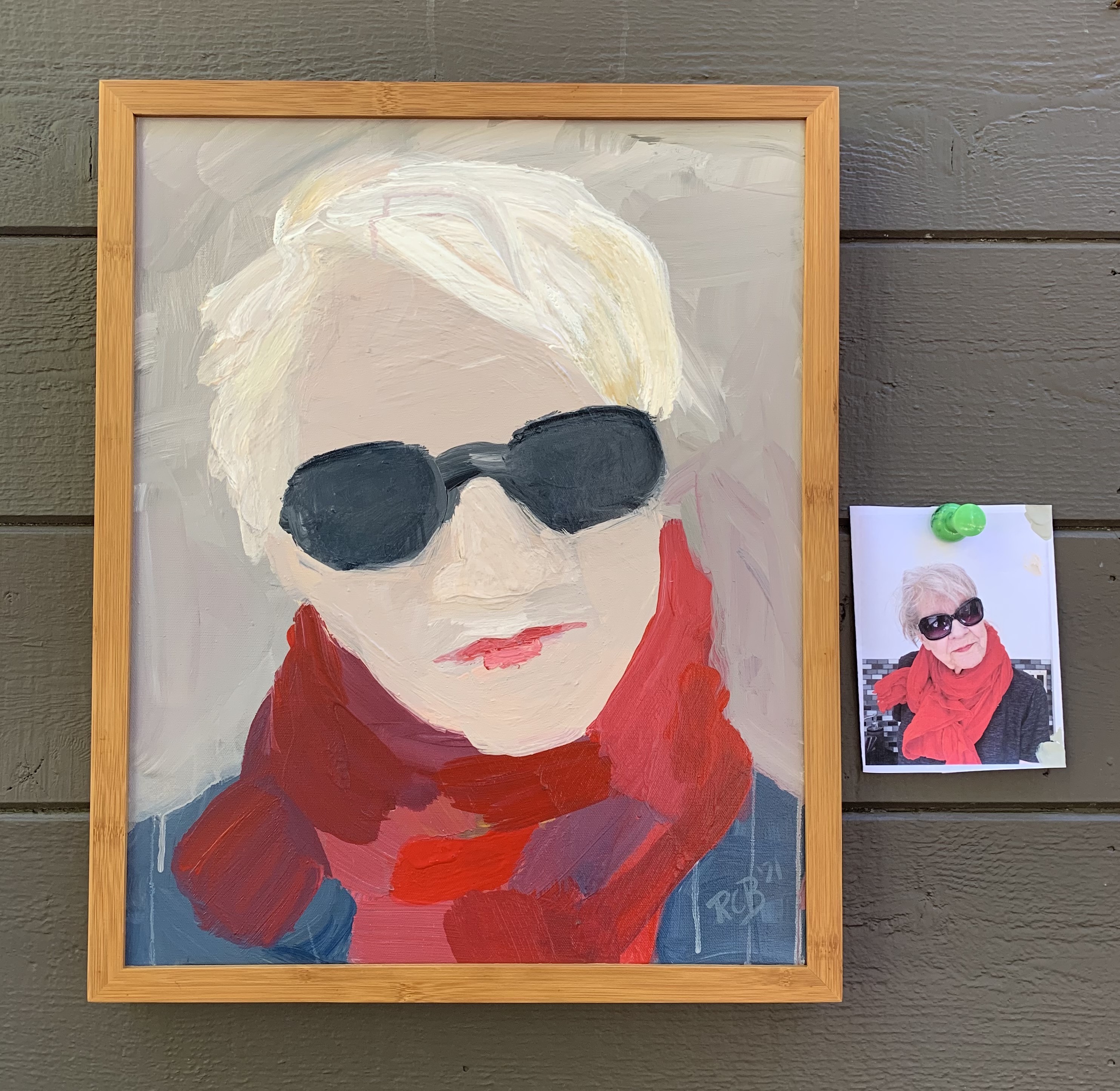 Client provides an image taken straight on with glasses, can include scarf and hat. Painted loosely with think paint. Frame optional.
